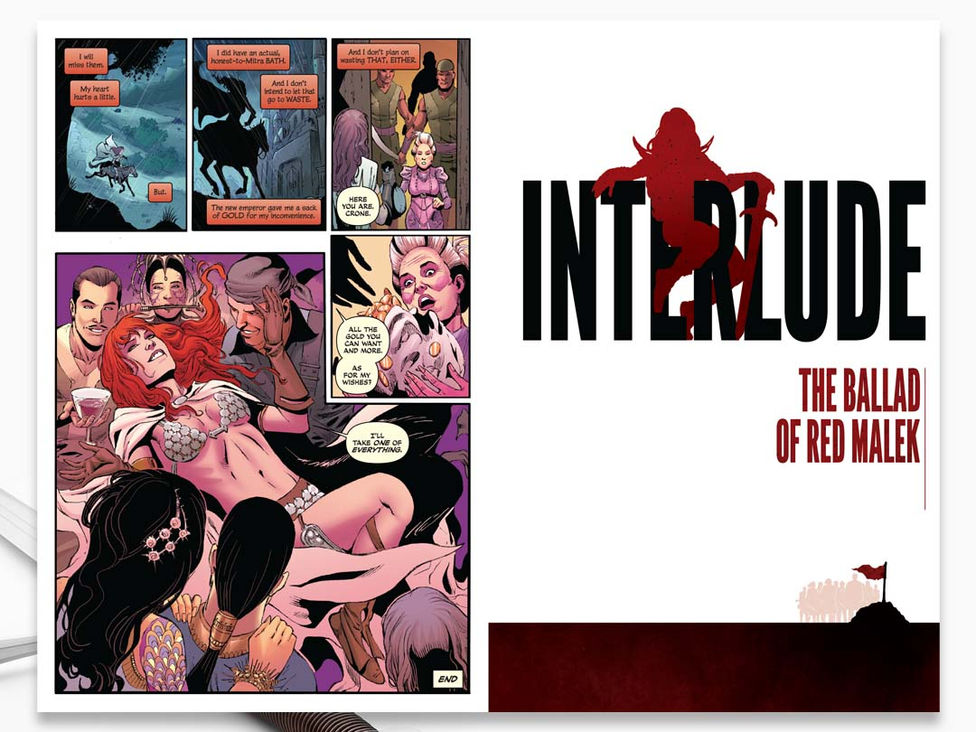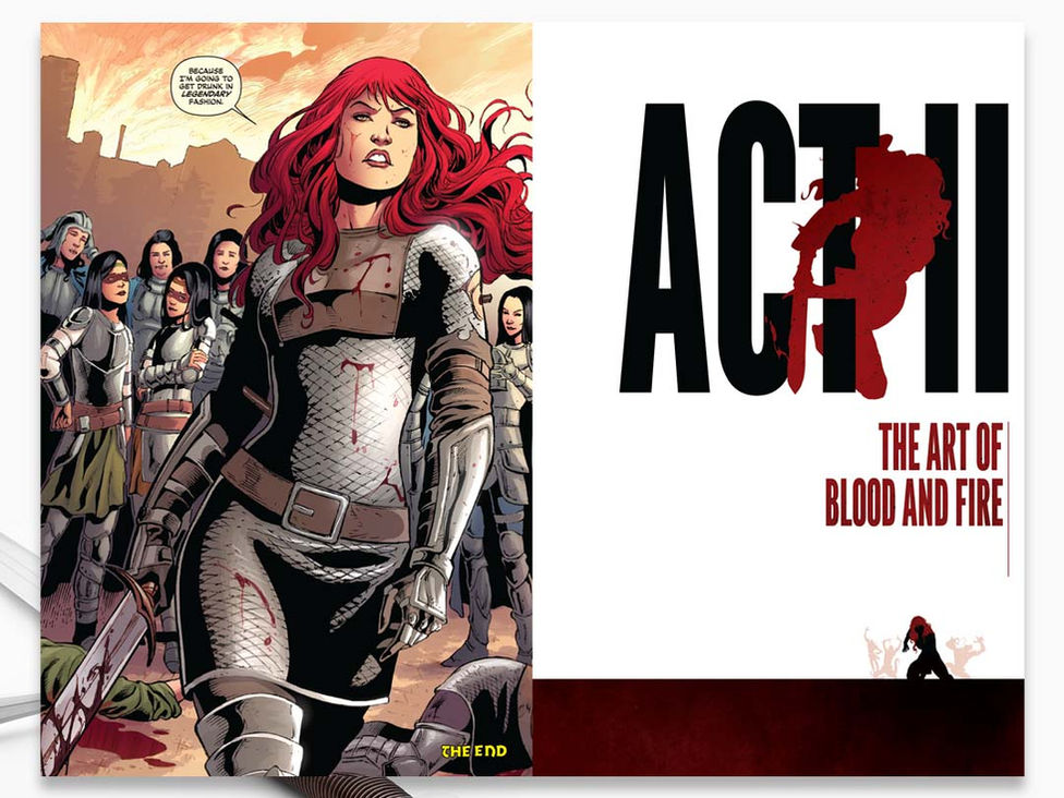 This 12.5" tall, oversized collection of Gail Simone's award-winning run on Red Sonja already featured over 512 of gorgeous art by Walter Geovani and the series's various, talented cover artists. To contrast this highly-detailed, full-color artwork, I chose a 2-color design, featuring large areas of negative space. Having designed many previous Red Sonja volumes, I wanted the cover for this deluxe volume to stand out from what the company had done before by giving it a more literary feel to it, all while showcasing the strength and violence of the character.