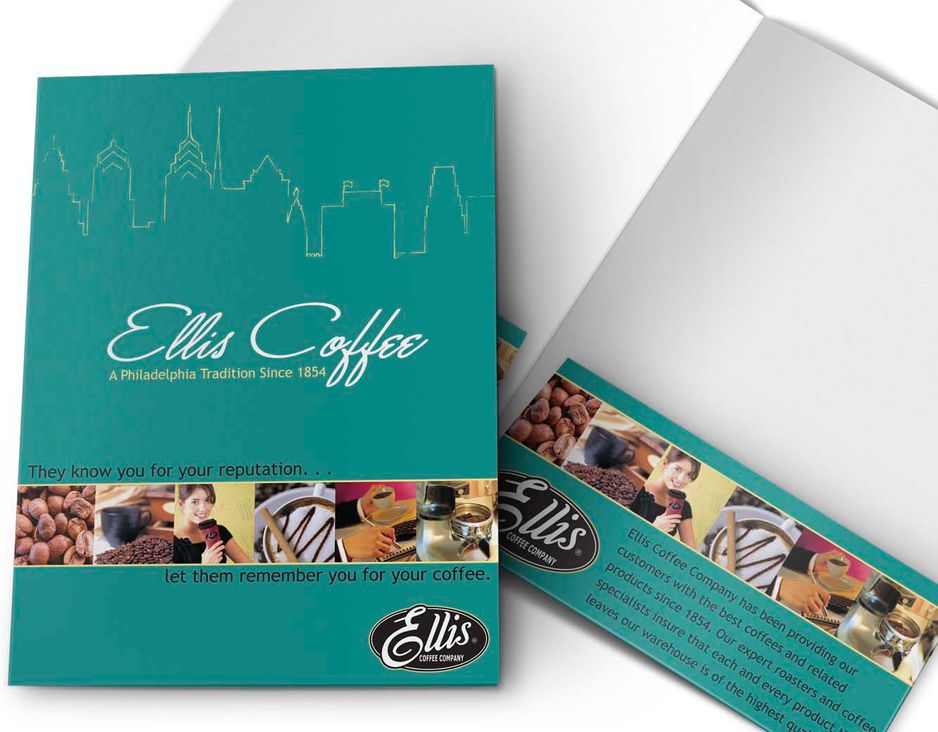 In 2006, just before leaving the company, I presented several different items to Ellis Coffee Company as part of an overall re-branding proposal. This included several new designs for machine labels, packaging, point of sale designs, and marketing materials. On this page are a few of those designs applied to their presentation folders. Ellis is very proud of their 150+ year history with the city of Philadelphia, and since so much of their business was in and around the Philadelphia metropolitan area (an area with very strong local pride) I wanted to include the city as a visual element in the designs, hoping that potential customers might feel an closer attachment to the company through its attachment with the city.