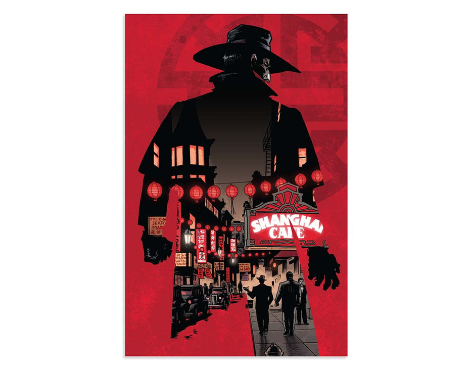 For Dynamite's collection of The Shadow: The Death of Margo Lane by Eisner Award-winning writer/artist Matt Wagner, I wanted to keep some of the art deco feel of the time period, as well as take the main character, who can blend into his surroundings, and play with that idea by using a double exposure technique inside of his silhouette. For this book, I was also asked to create a series of variant covers, including one I assembled from various elements of different pieces by Mr. Wagner.